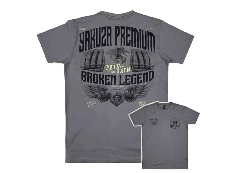 Yakuza Premium Broken Legend z kolekce Pain and Gain mluví hlasem těch, kteří si prošli peklem – a přežili. Dominantní potisk na zádech ukazuje dvě zaťaté pěsti s logem PAIN and GAIN, pod nimi heslo BROKEN LEGEND (Zlomená legenda) a křídla s lebkou, která nese hrdost i bolest zároveň. Tričko vzdává hold bojovníkům, kteří padli, ale nevzdali to.