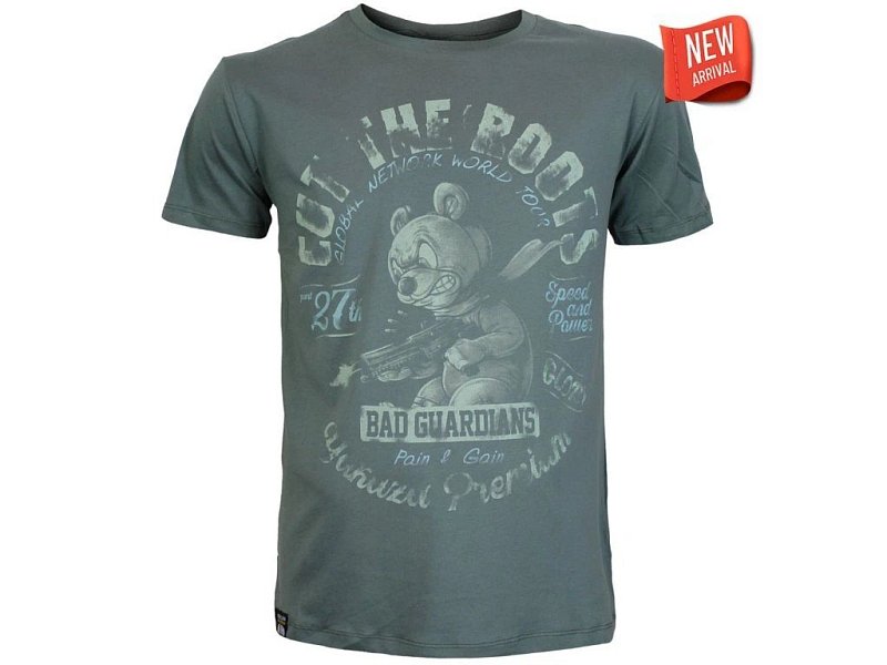 Na přední straně dominuje výrazný potisk s motivem rozzlobeného medvídka s kulometem, doplněný nápisy Cut the Roots – Bad Guardians – Speed and Power – Glory. Design působí provokativně a symbolizuje vzdor, odhodlání a sílu.