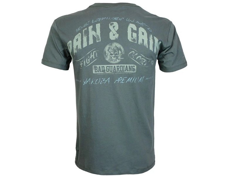 Zadní část trička zdobí nápis Pain & Gain – Fight & Glory – Bad Guardians, doplněný lebkou v čepici šaška, který podtrhuje surový a rebelský charakter trička.